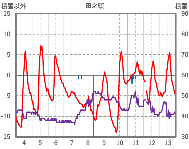 | 日 | 時 | 気温 | 降水 | 風向/風速 | 日照 | 積雪 | 降雪 |