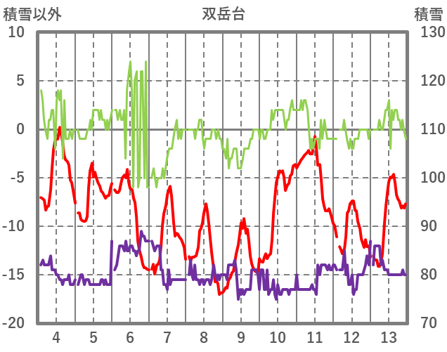 | 日 | 時 | 気温 | 降水 | 風向/風速 | 日照 | 積雪 | 降雪 |
