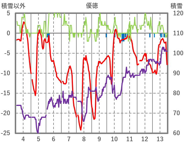 | 日 | 時 | 気温 | 降水 | 風向/風速 | 日照 | 積雪 | 降雪 |