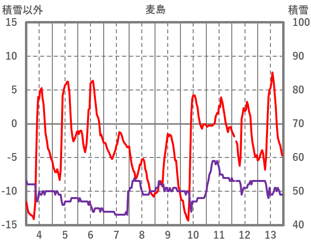 | 日 | 時 | 気温 | 降水 | 風向/風速 | 日照 | 積雪 | 降雪 |