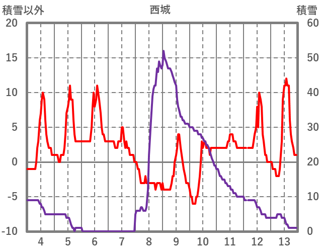 | 日 | 時 | 気温 | 降水 | 風向/風速 | 日照 | 積雪 | 降雪 |