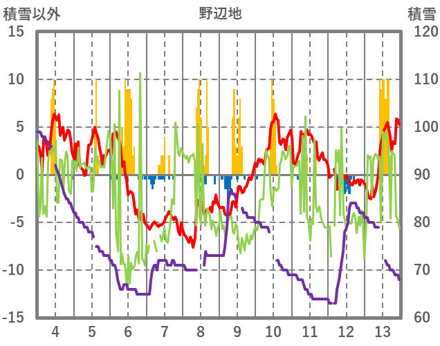 | 日 | 時 | 気温 | 降水 | 風向/風速 | 日照 | 積雪 | 降雪 |