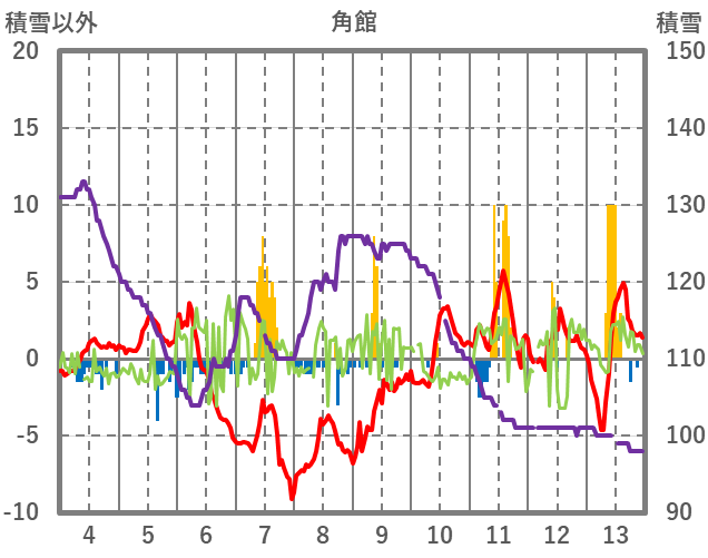 | 日 | 時 | 気温 | 降水 | 風向/風速 | 日照 | 積雪 | 降雪 |