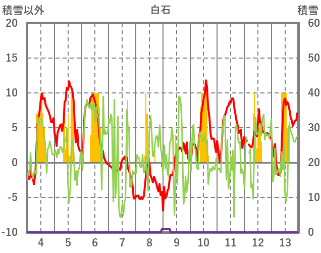 | 日 | 時 | 気温 | 降水 | 風向/風速 | 日照 | 積雪 | 降雪 |