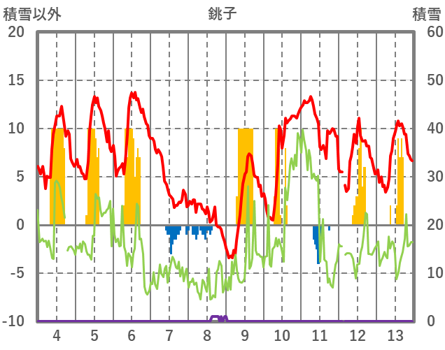 | 日 | 時 | 気温 | 降水 | 風向/風速 | 日照 | 積雪 | 降雪 |