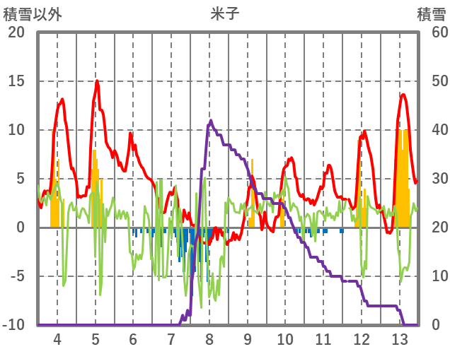 | 日 | 時 | 気温 | 降水 | 風向/風速 | 日照 | 積雪 | 降雪 |