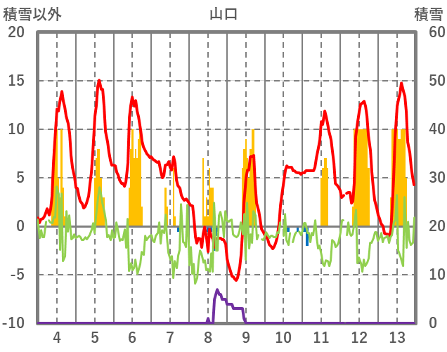 | 日 | 時 | 気温 | 降水 | 風向/風速 | 日照 | 積雪 | 降雪 |