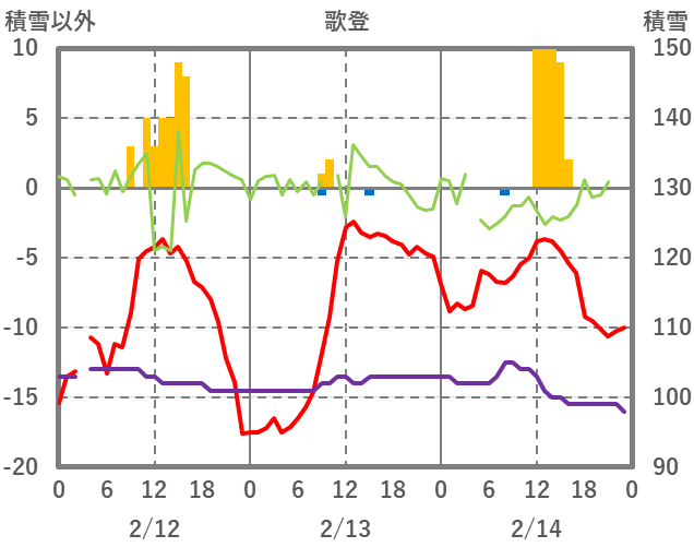 | 日 | 時 | 気温 | 降水 | 風向/風速 | 日照 | 積雪 | 降雪 |
