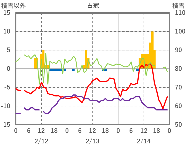 | 日 | 時 | 気温 | 降水 | 風向/風速 | 日照 | 積雪 | 降雪 |