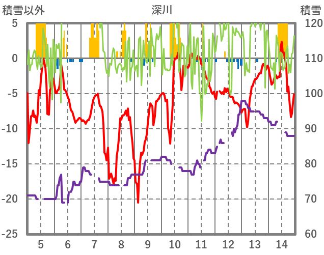 | 日 | 時 | 気温 | 降水 | 風向/風速 | 日照 | 積雪 | 降雪 |