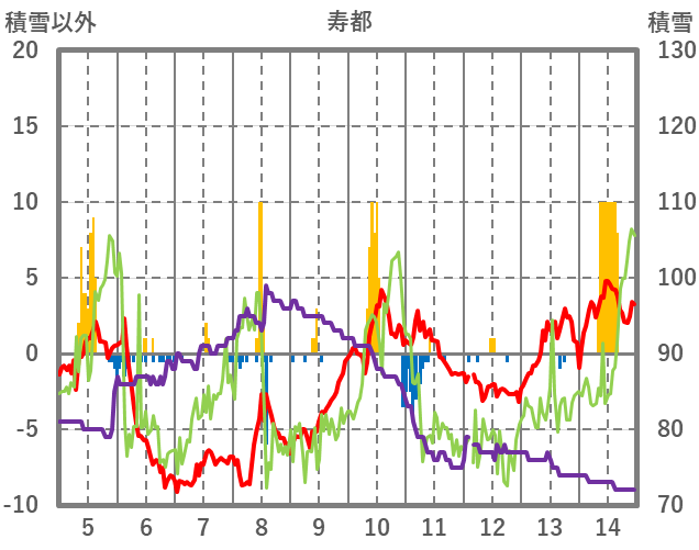 | 日 | 時 | 気温 | 降水 | 風向/風速 | 日照 | 積雪 | 降雪 |