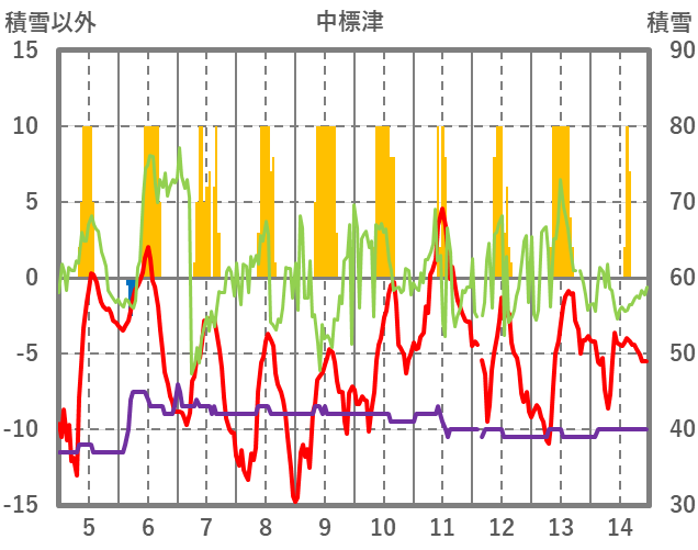 | 日 | 時 | 気温 | 降水 | 風向/風速 | 日照 | 積雪 | 降雪 |