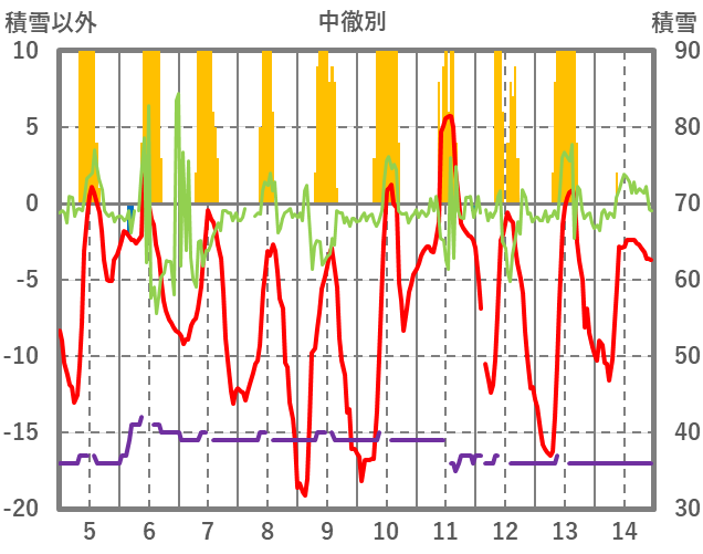 | 日 | 時 | 気温 | 降水 | 風向/風速 | 日照 | 積雪 | 降雪 |