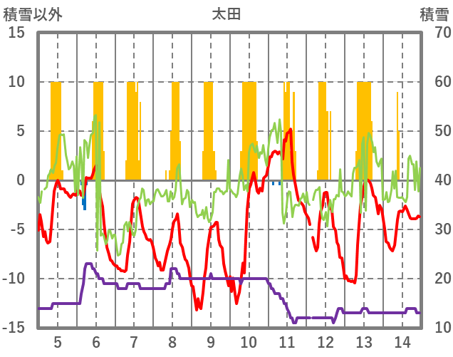 | 日 | 時 | 気温 | 降水 | 風向/風速 | 日照 | 積雪 | 降雪 |