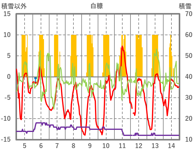 | 日 | 時 | 気温 | 降水 | 風向/風速 | 日照 | 積雪 | 降雪 |