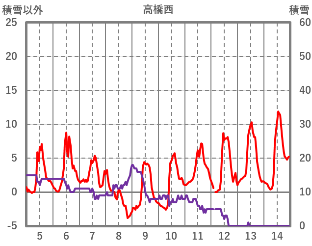 | 日 | 時 | 気温 | 降水 | 風向/風速 | 日照 | 積雪 | 降雪 |