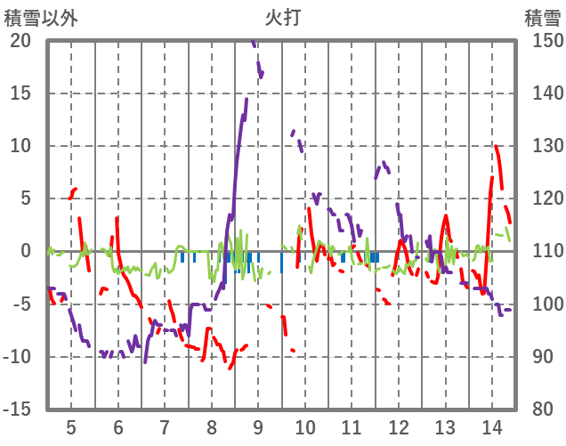 | 日 | 時 | 気温 | 降水 | 風向/風速 | 日照 | 積雪 | 降雪 |