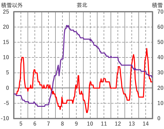 | 日 | 時 | 気温 | 降水 | 風向/風速 | 日照 | 積雪 | 降雪 |