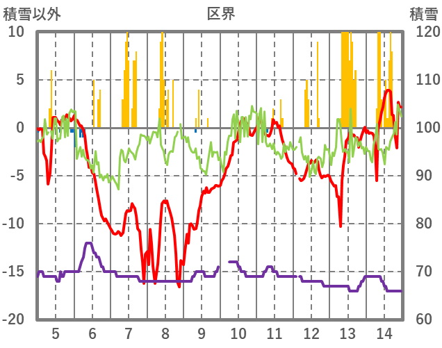 | 日 | 時 | 気温 | 降水 | 風向/風速 | 日照 | 積雪 | 降雪 |