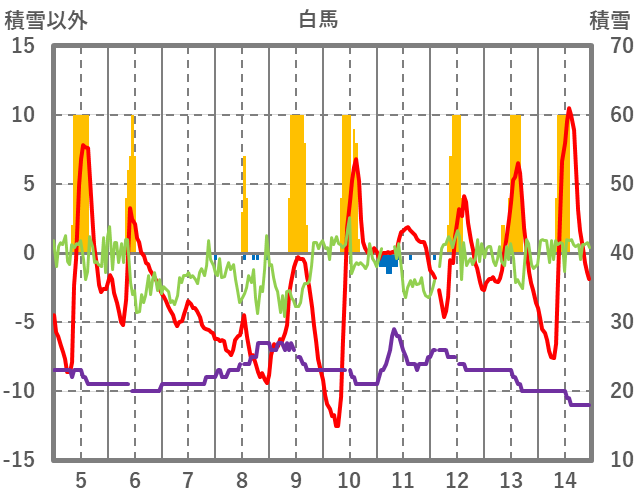 | 日 | 時 | 気温 | 降水 | 風向/風速 | 日照 | 積雪 | 降雪 |