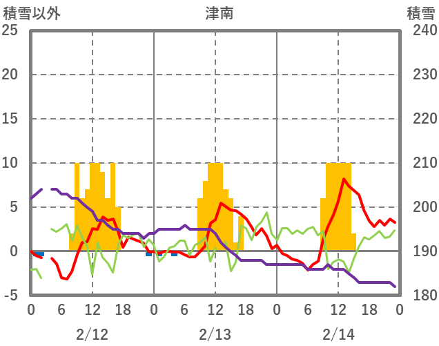 | 日 | 時 | 気温 | 降水 | 風向/風速 | 日照 | 積雪 | 降雪 |
