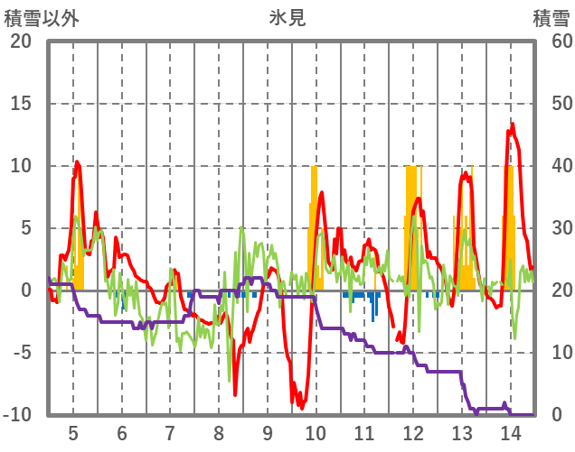| 日 | 時 | 気温 | 降水 | 風向/風速 | 日照 | 積雪 | 降雪 |