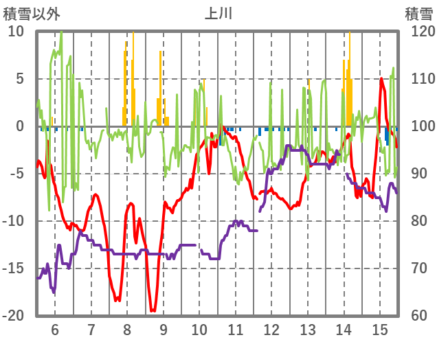 | 日 | 時 | 気温 | 降水 | 風向/風速 | 日照 | 積雪 | 降雪 |