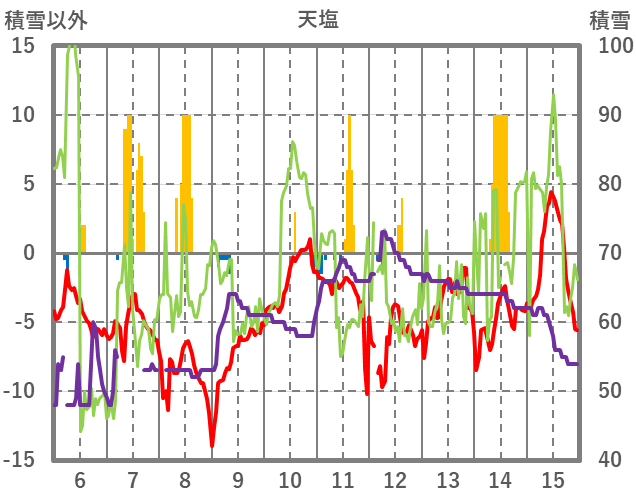 | 日 | 時 | 気温 | 降水 | 風向/風速 | 日照 | 積雪 | 降雪 |