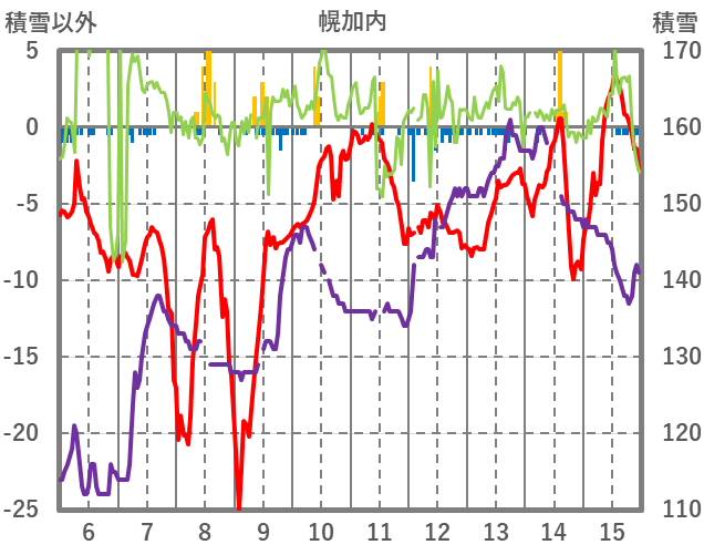 | 日 | 時 | 気温 | 降水 | 風向/風速 | 日照 | 積雪 | 降雪 |