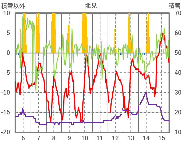 | 日 | 時 | 気温 | 降水 | 風向/風速 | 日照 | 積雪 | 降雪 |