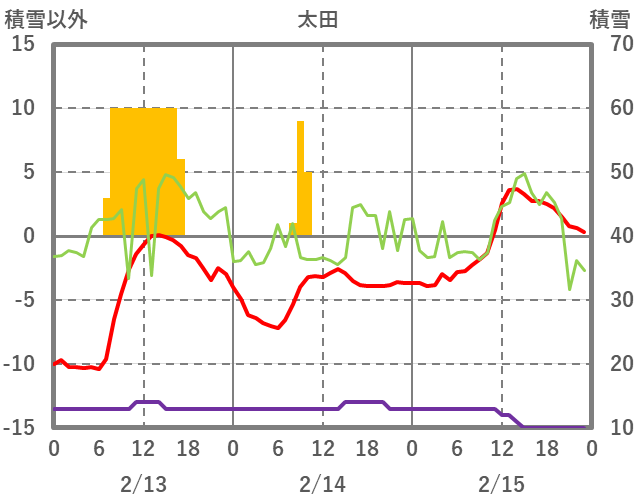| 日 | 時 | 気温 | 降水 | 風向/風速 | 日照 | 積雪 | 降雪 |