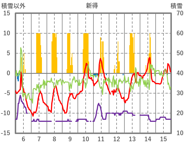 | 日 | 時 | 気温 | 降水 | 風向/風速 | 日照 | 積雪 | 降雪 |