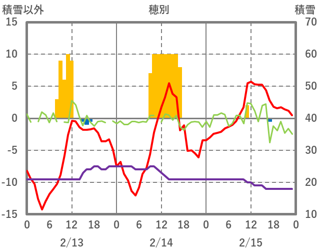 | 日 | 時 | 気温 | 降水 | 風向/風速 | 日照 | 積雪 | 降雪 |