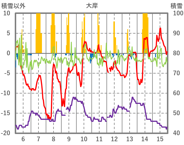 | 日 | 時 | 気温 | 降水 | 風向/風速 | 日照 | 積雪 | 降雪 |