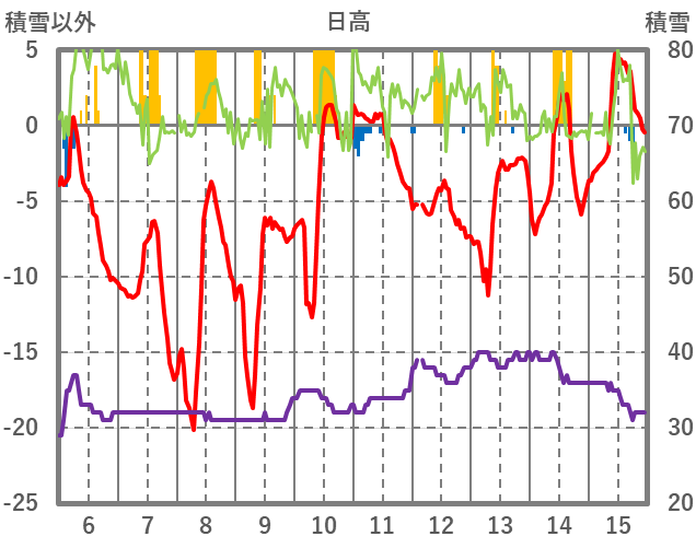 | 日 | 時 | 気温 | 降水 | 風向/風速 | 日照 | 積雪 | 降雪 |