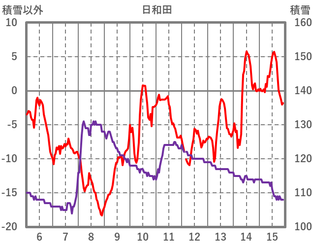 | 日 | 時 | 気温 | 降水 | 風向/風速 | 日照 | 積雪 | 降雪 |