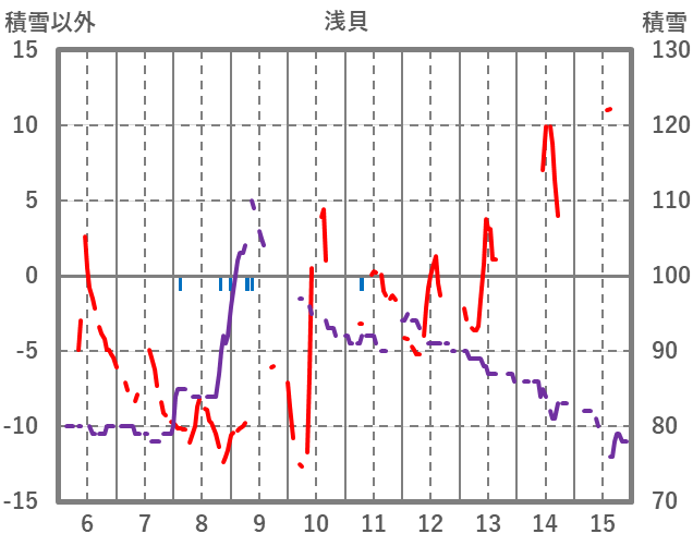 | 日 | 時 | 気温 | 降水 | 風向/風速 | 日照 | 積雪 | 降雪 |