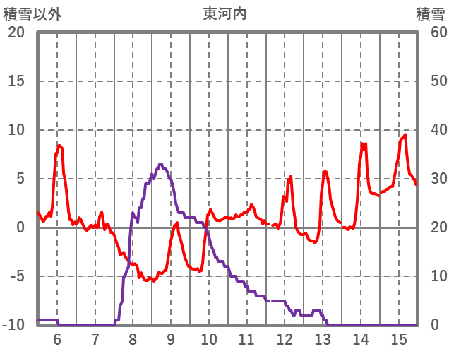 | 日 | 時 | 気温 | 降水 | 風向/風速 | 日照 | 積雪 | 降雪 |