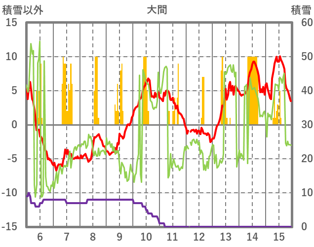 | 日 | 時 | 気温 | 降水 | 風向/風速 | 日照 | 積雪 | 降雪 |