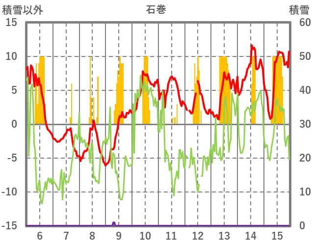 | 日 | 時 | 気温 | 降水 | 風向/風速 | 日照 | 積雪 | 降雪 |