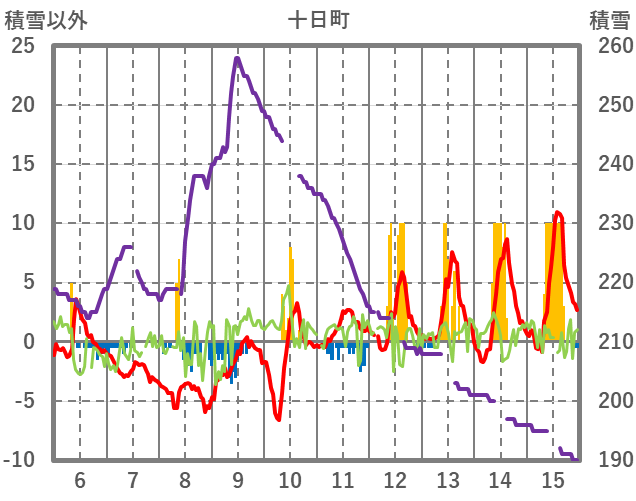 | 日 | 時 | 気温 | 降水 | 風向/風速 | 日照 | 積雪 | 降雪 |