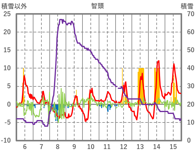 | 日 | 時 | 気温 | 降水 | 風向/風速 | 日照 | 積雪 | 降雪 |