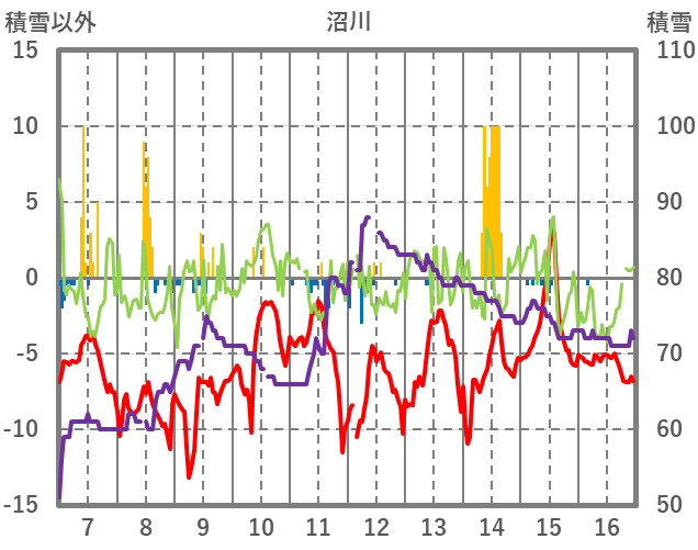 | 日 | 時 | 気温 | 降水 | 風向/風速 | 日照 | 積雪 | 降雪 |