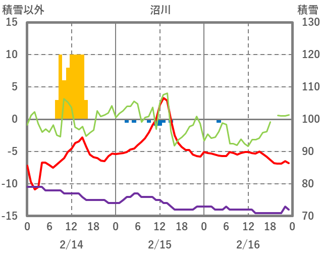 | 日 | 時 | 気温 | 降水 | 風向/風速 | 日照 | 積雪 | 降雪 |