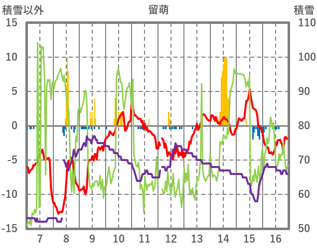 | 日 | 時 | 気温 | 降水 | 風向/風速 | 日照 | 積雪 | 降雪 |