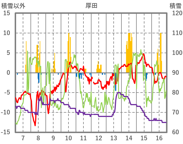 | 日 | 時 | 気温 | 降水 | 風向/風速 | 日照 | 積雪 | 降雪 |