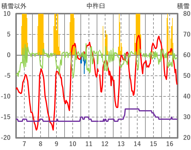 | 日 | 時 | 気温 | 降水 | 風向/風速 | 日照 | 積雪 | 降雪 |