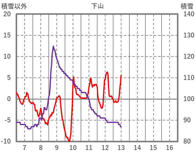 | 日 | 時 | 気温 | 降水 | 風向/風速 | 日照 | 積雪 | 降雪 |