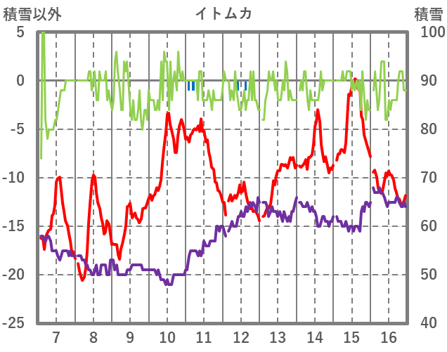 | 日 | 時 | 気温 | 降水 | 風向/風速 | 日照 | 積雪 | 降雪 |