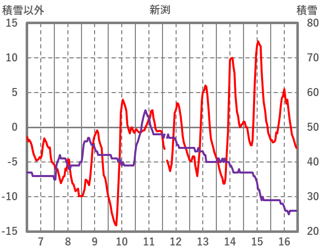 | 日 | 時 | 気温 | 降水 | 風向/風速 | 日照 | 積雪 | 降雪 |